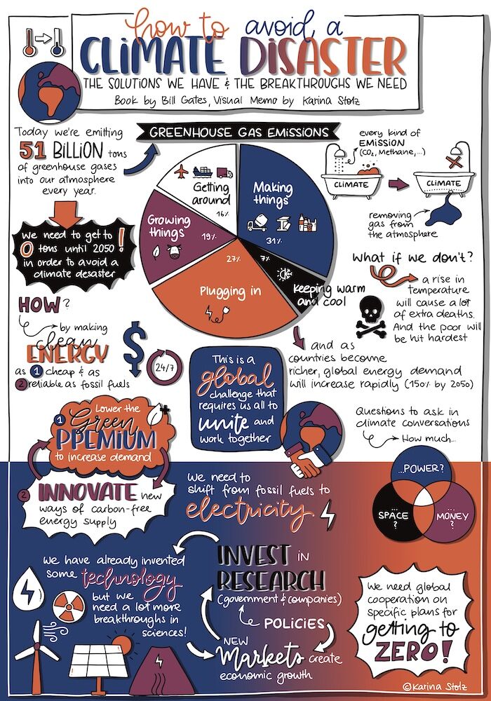 Das Visual Memo von Karina Stolz verdichtet die zentralen Ideen aus Bill Gates’ Buch „How to Avoid a Climate Disaster“. Mit klaren Illustrationen und prägnanten Stichpunkten zeigt es, woher die heute rund 51 Milliarden Tonnen Treibhausgase stammen (Herstellen, Strom, Landwirtschaft, Mobilität, Heizen/Kühlen) – und welche Hebel wir brauchen, um bis 2050 auf netto null zu kommen. Im Fokus: den „Green Premium“ senken, CO₂-freie Energie skalieren, Elektrifizierung vorantreiben, Forschung und Innovation stärken, wirksame Politik gestalten, neue Märkte öffnen und international zusammenarbeiten. So werden komplexe Zusammenhänge greifbar – und Handlungswege sichtbar.