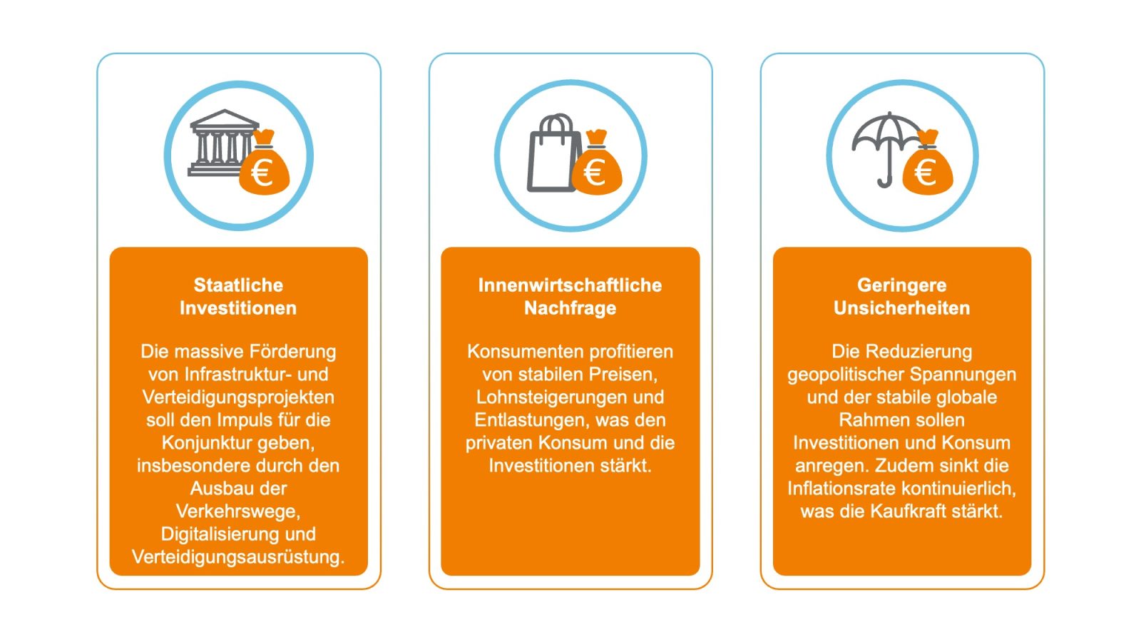 Insgesamt zeichnet sich für die nächsten Jahre eine graduelle Stabilisierung und anschließende Erholung der deutschen Wirtschaft ab, die vor allem von binnenwirtschaftlicher Dynamik und staatlicher Investitionspolitik getragen wird. Dies verweist auf einen positiven, aber eher moderaten Trend, der im Jahr 2026 an Fahrt aufnehmen dürfte.